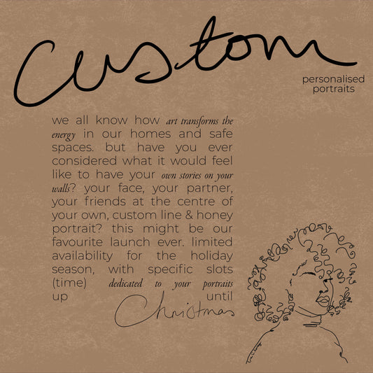 Available exclusively for this holiday season, we are opening up our commissions to the line & honey family! Purchase a personalised portrait print, email us the picture you want to draw, and that's it! Wait to recieve your new art print that has captured your essence perfectly.